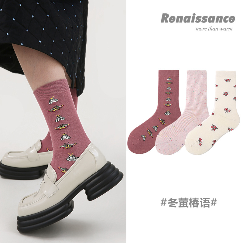 Renaissance-inspired pastoral style mid-calf socks for women made of premium combed cotton, featuring original designs in a trendy pink color scheme, packaged in a set of 3 pairs in a gift box?
